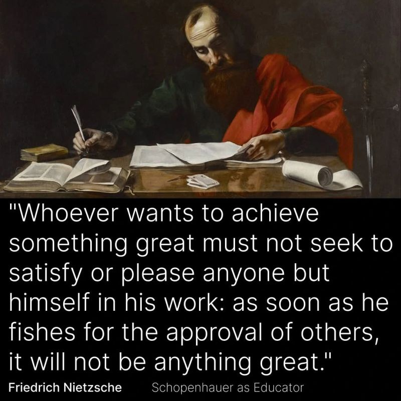 There is a line from Nietzsche's Schopenhauer as Educator that I have returned to more times than I can count. He writes that whoever wants to achieve something great must not seek to satisfy or please anyone but himself in his work, that as soon as he fishes for the approval of others, it will not be anything great.